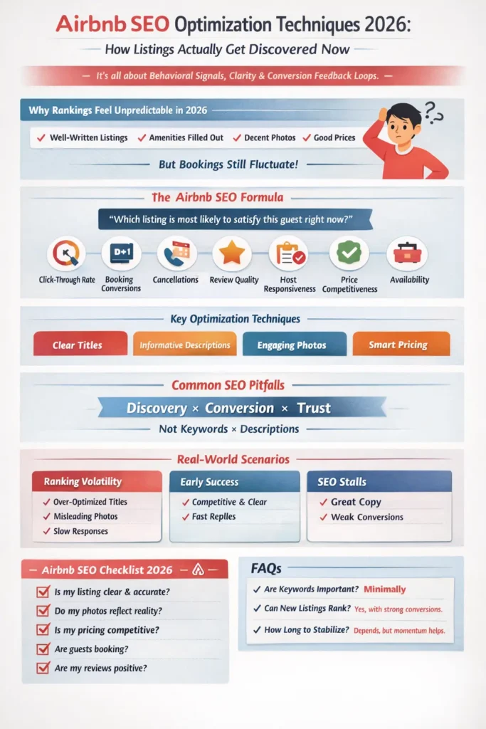 Short answer: Airbnb SEO in 2026 is less about keywords and more about behavioral signals, listing clarity, and conversion feedback loops.